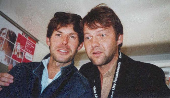 Und, als ich ihm dann auch noch meine Guido-Sprüche aufsagte, da war er hin und weg. "Und, Deine Sprüche sind einfach spitze! Gehn sie zu dritt hinaus zum Rhein, mach ich derweil im Bad mich fein!" Dabei zog er die Augenbrauen hoch und lächelte mich wieder so lieb an. Dann war er völlig perplex, daß er Christoph Bescheid sagte. Er tippte ihn an und machte ihn auf mich aufmerksam: "Boah, Christoph, hör mal, das mußt Du Dir unbedingt mal anhören!" Dann hörten beide aufmerksam zu. Christian: "Das gibt´s doch nicht. Hey, sehr gut gelernt!" Auch Christoph lächelte. Und ich setzte noch einen drauf: "Und: Ist Lukas schon im Rollstuhl steif, wird blondes Gift voll Wonne reif" Ich betonte das natürlich auch richtig, wie Guido in der Serie. Und, das war einmalig, denn in dem Moment, wo ich den zweiten Spruch aufsagte, beugte sich Christian zu mir nach vorne, um mich besser hören zu können. Ich sage Euch, das war ein geiles Gefühl! Wir waren uns total nah! Er meinte: "Ja, genau, so war das!" Ich hatte das Gefühl, er war froh, seine Sprüche nochmal gehört zu haben. Denn, offensichtlich hatte er sie selbst mittlerweile schon wieder vergessen. Als die beiden sahen, daß ich sie fotografieren wollte, legte Christian den Arm um Christoph und beide lächelten ihr schönstes Lächeln: "Guck da!", meinte Christian zu Christoph und zeigte auf meinen Fotoapparat. Dann sagten beide gleichzeitig "Ameisenkäse!" und dann.... ein Alptraum. Mein blöder Fotoapparat funktionierte plötzlich nicht. Ich bekam voll die Panik. "Mist, funktioniert nicht!" Ich zeigte ihn den beiden und Christian meinte zu Christoph: "Siehste! Fotoapparate und Kameras, die mögen uns nicht!" Und, dann sagte er zu mir gewandt: "In der Kamera ist sicher´n bißchen Koks drin!" und schenkte mir wieder sein unvergleichliches Guido-Lächeln. Ich: "Ja, ja, bestimmt!" Und, wir mußten beide lachen. Ich bat die beiden, ein zweites Mal, für mich zu posieren: "Können wir das bitte noch einmal wiederholen? Bitte!" Christian: "Nochmal?" "Ja, bitte!" "Ja, gut!" Und anstandslos lachten sie für mich ein zweites Mal in die Kamera. Glücklicherweise hatte es beim zweiten Mal auch geklappt, wenn auch einen Tick zu langsam, wie man auf dem Foto erkennen kann. Denn, Christian hat ja dann schon woanders hingeguckt.
