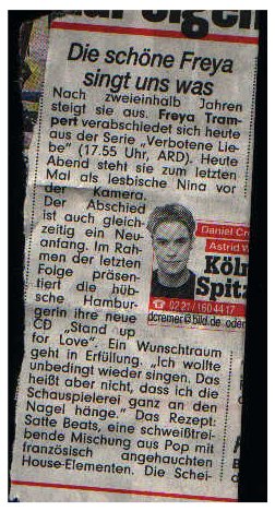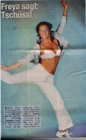 "Freya bummelt mit ihrem Freund durch Köln und setzt sich in ein Strassencafe. Er erzählt, daß sie ständig arbeitet und selbst wenn sie eigentlich frei hat, zu wenig Zeit für ihn hat. Es werden auch ein paar kurze Szenen eingeblendet und Freya erzählt, daß Nina lange so eine Art Kummerkasten war. Nach einem kurzen N&E-Ausschnitt sagt Freyas Freund dann noch, daß es zwar sehr ungewohnt war, zu sehen, wie sie eine Frau küsst, aber es hätte ihm wohl noch weniger gefallen, wenn es ein Mann gewesen wär. Dann darf Freya noch kurz ein Lied ansingen und berichten, daß sie an einer CD arbeitet."