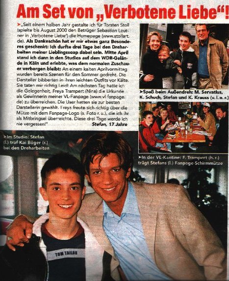 Seit November 2000 aktualisiere ich für Torsten Stoll (Sebastian) seine eigene private Homepage: http://www.stollart.de Da Torsten noch guten Kontakt zu Verbotene Liebe hat und wenig Geld ;-), hat er mir einen dreitägigen Set-Aufenthalt "geschenkt"!! Und das kriegt man bekanntlich für kein Geld der Welt und ist für einen großen VL-Fan viel wert - sehr viel!
