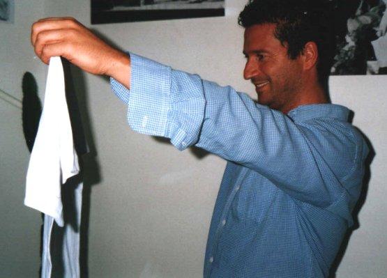 Erst noch runter in die Waschküche, Wäscherauftragen in den obersten Stock, doch für einen Leichtathleten wie mich war dies natürlich kein Problem, wie Angelo richtig erkannte. Seine Wohnung ist nett eingerichtet, zweistöckig und mit Balkon. In der Fernsehecke liegen angestrichene Drehbücher, an den Wänden hängen schöne Fotos von ihm und in der Ecke steht sein PC. Er wählt sich erstmal ins Internet ein, checkt seine Mails, beantwortet Käuferanfragen (ebay-Fan *g*), trägt sich vor lästigen Mailverteiler aus und auch meine Mails finde ich in seinem Outlook wieder. Ich kann euch hiermit garantieren, Angelo tippt seine Mails an euch alle selbst und zwar ohne auf den Bildschirm zu schauen...Mailt ihm doch mal und probiert es aus: angelo@angelofranke.de