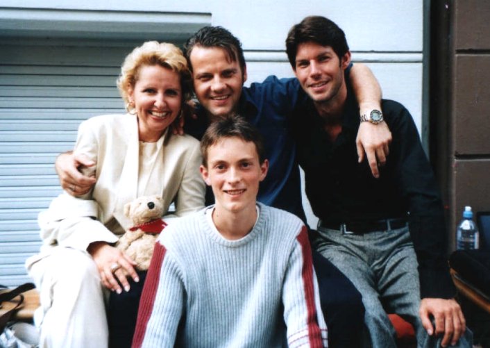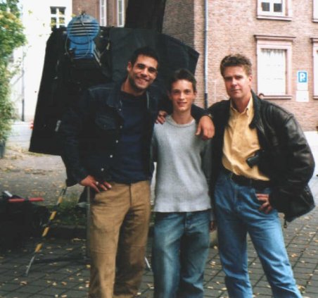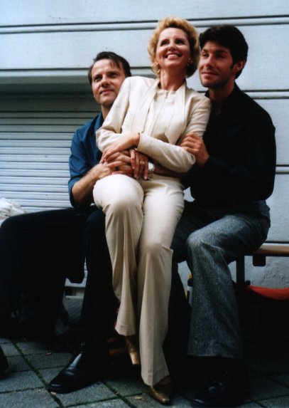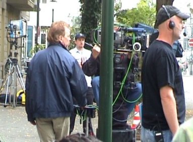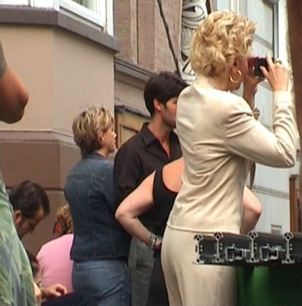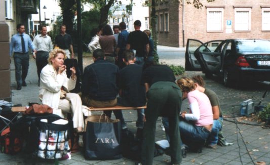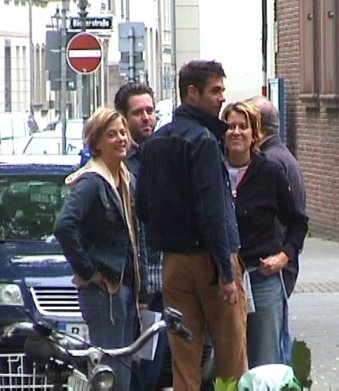 Ein Grundy Ufa-Bussle fährt vor. Wen erkenne ich da... Gabriele Metzger (Charlie), Christoph Dostal (Lukas), Christian Rudolf (Guido) und Yvonne Burbach (Cecile). Sie kommen frisch geschminkt direkt aus dem Studio in Bocklemünd. Sie kommen ans Set und wissen genau was zu tun ist. Christian erkennt mich sofort wieder. "Ahh...hallo!!!" Und da ist sie wieder, die Guido-Stimme. Und noch freundlicher! Und seine Stimme sollte bald auch noch halb Düsseldorf hören...