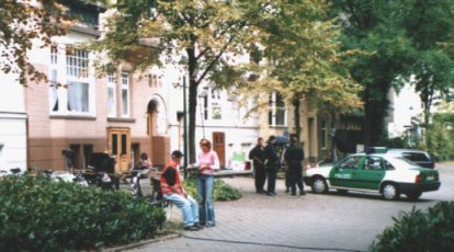 Schaulustige Bewohner des Hauses schauen aus den Fenster, aber nur sehr kurz und Carsten beruhigt sie zwinkernd: Wir stürmen nicht wirklich! Carsten und Magnus sind zufrieden, sie haben die verlorengegangene Zeit wieder reingeholt und sind nach zwei Stunden mit den zwei Szenen fertig. Danke, check!
