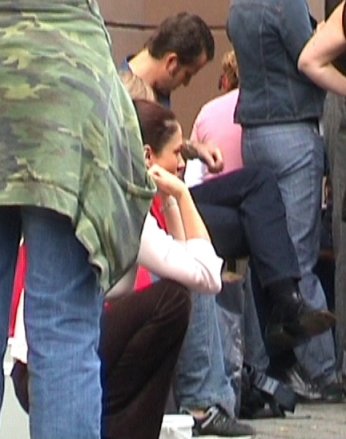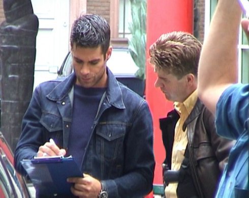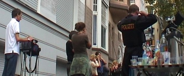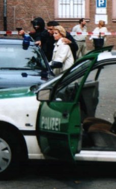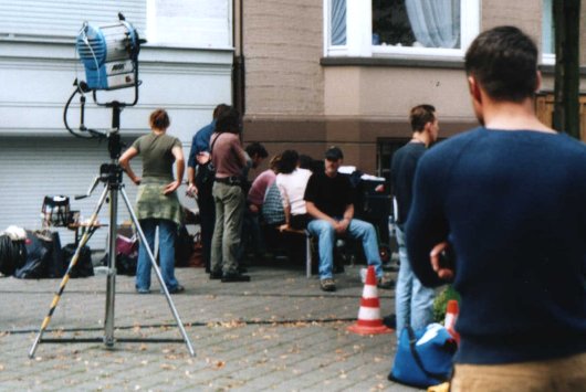 Die Einstellungen werden nacheinander gedreht. Beim Außendreh wird nur mit einer Kamera gearbeitet. Und somit kommt das ganze etwas verwirrend rüber, eigentlich total lächerlich. Man kann sich fast nicht vorstellen, wie spannend das im Fernsehen später zu sehen sein wird... Christian hält Yvi die Knarre an den Kopf. Er ist Linkshänder und hat deshalb kleine Schwierigkeiten, dennoch kein Problem für ihn. Plötzlich wacht ganz Düsseldorf auf: "Wenn nur einer den Helden spielt - dann drück ich ab - ist das klar?!" Aber in was für einer Lautstärke. Unglaublich. Das ist ein echter Schauspieler... Da Christian diesen Satz ingesamt ungefähr zehn Mal sagen musste, hatte Yvi danach Ohrenschmerzen...