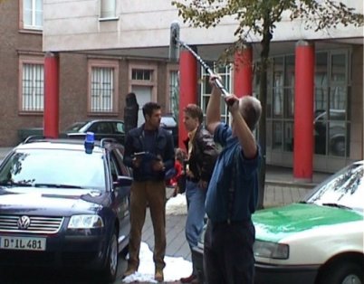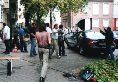 Carsten stellt mir Magnus Heithoff alias Kommissar Feld vor. Der Zivileinsatz-Wagen ist das Auto der Grundy Ufa. Das Berliner Kennzeichen und das Firmenschild wird überklebt und schon ist es ein Düsseldorfer Polizeiauto. Die erste Szene wird geprobt und zum ersten Mal heißt es für heute "Die Straßen bitte zumachen, wir drehen." "Kamera läuft." "Achtung - und bitte!"
